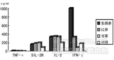 生晒参、红参及甘草在没有任何诱生剂参与的情况下,体外诱导PBMC产生细胞因子,结果显示对照组的TNF-α、SIL-2R、IL-2、IFN-γ效价明显比实验组低,而生晒参诱导的PBMC上清液中IFN-γ水平又明显高于红参组,P<0.01,差异有高度显著性。见图1。