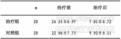 2组治疗前后经配对t检验,P<0.01,组间经t检验,P>0.05,差异无显著性,见表1。