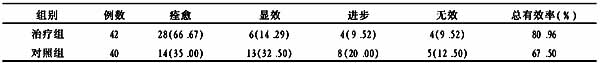 1.4 治疗方法 82例患者按就诊顺序随机分为治疗组42例及对照组40例。治疗组:用注射阿奇霉素针剂(湖北瑞康药业有限公司生产)500mg加入生理盐水500ml中静脉滴注,每天1次,连续用2天;对照组口服阿奇霉素片(大连辉瑞制药)1000mg顿服。