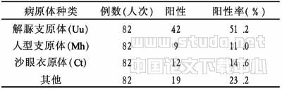 1.3.2 检测结果 82例中解脲支原体感染有42例,占51.2%;人型支原体培养阳性9例,占11.0%;衣原体检测阳性率14.6%,结果见表1。