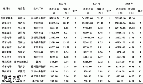 表2 2003~2005年我院不同厂家钙拮抗剂消耗金额构成比及排序