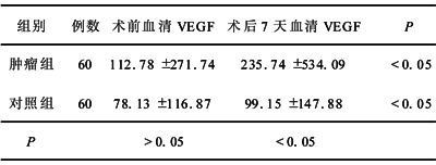 2.1 围手术期血清VEGF水平比较 围手术期两组血清VEGF水平见表1。从表1可见,术前肿瘤组血清VEGF水平虽高于对照组,但差异无显著性(P>0.05)。术后两组血清VEGF均较术前明显升高(P<0.05)。肿瘤组术后血清VEGF较对照组明显增加,两组差异有显著性(P<0.05)。