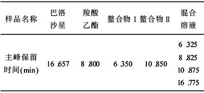 2.3 系统适用性试验 取1.2项溶液各20μl分别注入液相色谱仪进行测定,并记录色谱图,测定结果见表1及图2。试验结果表明:巴洛沙星与各中间体在上述色谱条件下能有效地分离。