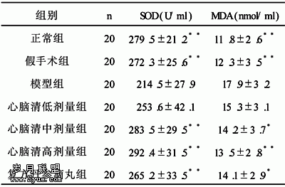实验结果表明,模型组大鼠血清SOD活性较正常组降低,各组与模型组比SOD活性均有所升高,模型组大鼠血清MDA浓度较正常组升高,各治疗组与模型组比,MDA浓度均有所降低。