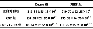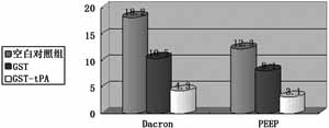 2.2 在体实验中机体内血小板沉积的影响 在体实验研究表明,Dacron组中,GST-tPA组血管血小板沉积明显少于GST组和空白对照组载体组和空白对照组,(P<0.05);PEEP组也得出相同的结论。见表1。