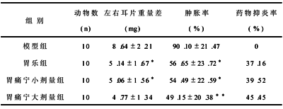 2.1 抗炎实验 小鼠耳肿胀法,昆明种小鼠40只,雌雄各半,体重18~22g,随机分为4组:模型组、胃乐组、胃痛宁小剂量组、胃痛宁大剂量组,每组10只,按0.1ml/10g体重分别灌服蒸馏水(0.1ml/10g)、胃乐(0.468g/kg)、胃痛宁胶囊(小剂量组16g/kg、大剂量组32g/kg)。给药后30min后用分析天平称重,求出耳片肿胀率及药物抑炎率。