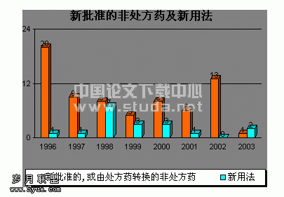 美国对处方药的销售管理非常严格,处方药通常专门陈列于一个房间内,消费者一般是看不到药品的。估计这也是在美国称呼“药房”而不是“药店”的原因。处方药的标识非常明了,凡是处方药,都必须由生产厂家在药品标签上印上“Rx only”字样,分类清楚,使人一目了然,同时也方便对处方药加强管理。对与非处方药,管理则较为宽松。销售非处方药一般不需要申请药房许可证件,也不要求配备执业药师,和普通商品一样,陈列在敞开式柜台,由消费者自行选择购买。非处方药的标签上则不要求印上醒目的表识。事实上,美国非处方药所占的市场份额很少,约只占药品销售额的16%。美国现有的非处方药按类别划分有80多类,范围从粉刺治疗药物延伸到减肥药品,市场上的非处方药大约有100,000多种,包括的活性成分大约800种。和处方药一样,美国药品审评中心对非处方药也要进行评价以确保它们正确地标签,并且利大于弊。由于大多数非处方药在立法(规定药品上市前必须要证明其安全性和有效性)之前已经上市多年,这些药物作为美国“非处方药审评计划”的一部分,美国对它们的成分和标签也在进行评价。“非处方药审评计划”的目标则是对每类药品都建立“非处方药专论”。“非处方药专论”就相当于一部“处方书”,包括可接受的成分,剂量,配方,标签和试验。“专论”不断地在更新以补充其它必要的成分和标签。符合“非处方药专论”的药物不需要FDA事先审批即可上市,但对于那些不符合的药品则必须通过新药审评程序(NDA)进行独立的审评才能上市。对于第一次进入OTC市场的新成分需要按照NDA程序进行审批。例如:一个新的OTC药品第一次被批准上市,或以前批准为处方药上市的药物转为非处方药就必须经过NDA程序。下图表示从1996年到2003年新批准的非处方药(包括从处方药转换过来的非处方药)和已上市的非处方药被批准使用的新用法。由图表中我们可以窥见,近年来美国每年批准的非处方药数量不多。
