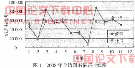 (1)图书借阅的数量总体呈现出一种波状曲线。通过对2008年图书馆借还统计数据表格所做的曲线图可以明地看出,全年以7月为界划分为两个周期,在假期内的2月和8月借还量最低,但接下来的3月和9月达到高峰,之后的3个月,借还两种曲线显示了不同变化:借书曲线总体保持下滑,而还书曲线则略有上升。但从全年的角度看,还书曲线大体还是随借书曲线保持一致的变化(见表1和图1)。