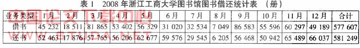 图书的流通借阅是图书馆最主要的工作职能之一,尽管的兴起、数字资源的建设使这一传统职能在高校图书馆工作中所占的比重有所下降,但仍然占据着首要地位。据浙江工商大学图书馆2008年的统计,当年渎者到馆人次为3O万人次,借阅图书达到了868032册次。按全校24700余名学生,平均每人到馆l2次,年借书量为35本,即在校期间内(扣除假期),每人每月到馆1次,月读书量约为4本。