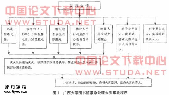 广西大学图书馆的领导高度重视防火工作,定期对工作人员进行防火培训,以提高图书馆员工的防火意识;要求所有图书馆的工作人员学会使用灭火器;不定期地进行防火演习;安排图书馆物业人员24小时值班,并经常检查线路,及时更换日光灯灯管及其他电力设施等,最大限度地减少火灾隐患。针对火灾的发生,图书馆领导还制定了周密、具体的紧急处理火灾事故预案。广西大学图书馆紧急处理火灾事故程序见图1。
