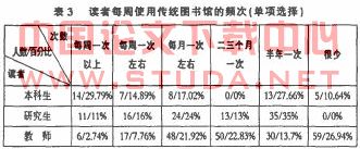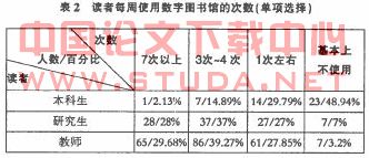从表2和表3可以看出,传统图书馆仍是本科生获取信息资料的主要来源。而数字图书馆则成为研究生及教师获取信息资料的主要来源。这从另一个方面印证了表l的调查结果:教师及研究生成为数字图书馆的主要使用者。相对本科生而言。教师和研究生对科研信息的需求量更大。需要大量学术性强的新颖信息。而数字图书馆拥有的国内外各种学术期刊及专业性很强的学术资源数据库正满足了他们这方面的需求。另外。数字资源的使用特点也起到了很大作用:第一。传统图书、期刊资源的数量有限.大学图书馆采购一般图书的复本量为3册左右,期刊就更低。这样就限制了读者的使用,而数字资源恰好弥补了这一不足;第二。教师和研究生具备了相对充足的上网条件.而且他们的检索技能也相对较为熟练。