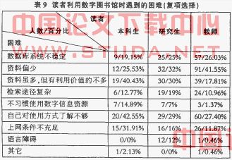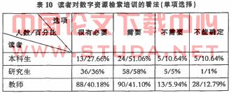 影响读者使用数字图书馆的主要原因是:“资料偏少”、。资料虽多.但有利用价值的不多”、。自己对使用方式了解不够”、“数据库系统不稳定”等。这说明华南农大图书馆的数字文献资源建设还有待加强。应深入调查读者的需要。增加对日的有利用价值的文献资源数量。同时还要加强与学校中心、数据库供应商间的协作,促进服务器、交换机、存储系统等硬件设备的建设,保障数字化文献系统正常、高效运行。最后。还应加强读者的培训.特别是数据库检索技巧方面的培训。从表10可以看出: