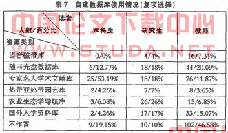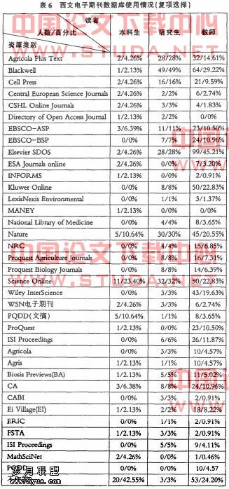 从表5、表6、表7可以看出:(1)中文期刊数据库的利用率较高;(2)教师、研究生使用频率较高的中文电子期刊数据库分别是:期刊网、中国优秀博硕士全文库、维普中文期刊全文数据库.本科生则是:中国期刊网、维普中文期刊全文数据库、中文社会引文索引数据库;(3)西文电子期刊的使用率偏低。如果把“不作答”看作是没有使用过的话,42.56%的本科生没有利用过西文电子期刊数据库。24.20%教师也没有利用过西文电子期刊数据库。笔者认为原因主要有:一方面是读者本身的原因。西文电子期刊数据库对使用者的要求比中文高。除了要具备较好的专业外语水平外。还要求有较好的检索技巧;另一方面跟拥有的数据库资源数量及内容有关。华南农大图书馆可供使用的中文数据库种类比较齐全,而西文数据库种类少,还难以完全满足读者需求;(4)部分西文数据库利用率为零。这主要来源于两方面:一是因为国家科技图书馆可以免费提供给各科研院校使用的西文数据库;二是数据库商提供的附带产品;(5)学生较多利用自建数据库,而教师却很少利用。这是因为自建数据库大多是读者使用较多的图书馆本身的自有资源(如随书光盘数据库)或经过整合的网上学术资源(如专家名人学术库、农业生态学导航库等),使用方法简单并且实用,比较符合学生读者的需求。但由于自建数据库存在知识含量低以及后期的维护更新慢等原因。因而在教师中利用率不高。