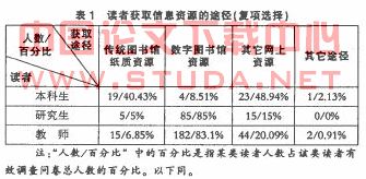 读者获取信息资源的途径各不相同。研究生及教师以数字图书馆资源为主,而本科生则是以传统图书馆纸质资源及其它网上资源为主。分析其原因,有以下几点:(1)华南农大数字图书馆的宣传力度还不够。特别是针对本科生的宣传力度不够,有相当一部分本科生读者根本不知道数字图书馆;(2)本科生读者检索技能较差。特别是低年级的本科生基本不具备文献检索技能,他们无法使用数字图书馆中的主要数据库。而容易掌握其它网上资源中的搜索引擎使用技巧。他们会利用其它网上资源:(3)由于本科生在大学里接受的是相关专业的基础教育,他们科研活动较少,需要的资料多为各类学习辅导用书,因而侧重于各专业基础知识的纸质文献成为他们获取信息的首选。