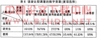 从表8可以看出:电子期刊的读者满意度远远高于电子图书.特别是中文电子期刊。电子期刊利用率远远高于电子图书的利用率,笔者认为有以下几方面原因:首先,电子期刊和电子图书所含信息资源侧重点不同;其次,人们还不能适应利用机阅读篇幅很长的电子图书;第三,华南农大图书馆电子图书的数量和种类相对较少,不能满足读者需求。