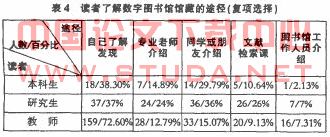 由表4可知,读者了解数字图书馆馆藏的首要途径是。自己了解发现”,其次是“同学或朋友介绍”。这表明读者间信息的互相交流、传播是他们获取信息资源的重要来源。通过。文献检索课”及。图书馆工作人员介绍”这两个途径来了解数字图书馆馆藏的比例都较低,这从一个侧面反映了华南农大图书馆对于数字信息资源的宣传力度还不够,与读者之间的沟通与交流还有待加强。