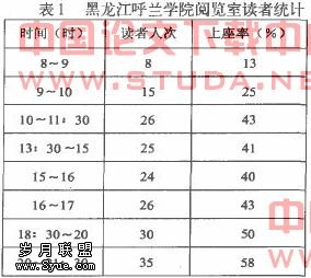 高校图书馆的藏书是以教学为主,收藏有关自己各专业的各类书籍及文学类等普及读物和与教育科研相关的文献资料以及国内外的信息资料。作为高校图书馆在可承受的范围内,是有可能向社会提供一定的服务的,但要做到彻底开放是不可能的,也是不现实的。高校图书馆必须保证对校内读者服务正常有序,在“度”的范围内向社会读者服务。哈尔滨师范大学图书馆是开展社区服务较好的典范,现以呼兰学院现刊阅览室为例:2006年11月22日随机统计结果见表1。