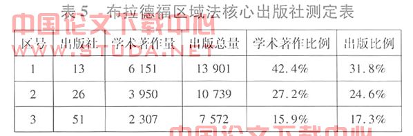 其中,a为布氏常数,取a=2,则出版社及文献分布为:处于第一区的出版社仅13家,但其出版的学术文献占学术文献总量的42.4%;出版的经济文献总量占到四年出版总量的31.8%,因此有理由认为这一区域内的13家出版社为经济学领域“核心出版社”,如表5所示: