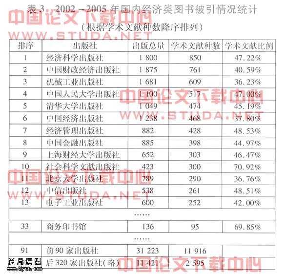 由于《全国总书目》是国内具有代表性的权威书目,出版社覆盖全国各地,基本上能反映我国经济类文献的出版情况,本文试选取2002—2005年《全国总书目》中的经济类书目作为统计样本。由于主要是查证经济类学术研究图书的被引情况,因此对统计样本进行初选,排除以下5类经济类图书:①教材、教学参考书(影印版除外);②培训及资格用书;③经济学基础知识、操作实务、普及读本、创业及励志类图书;④工具用书以及连续性的论文集、评论、年度报告;⑤地方(地区)经济类图书。