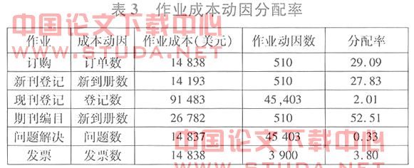 期刊订购由订单触发,其成本动因为订单数。新刊登记和现刊登记的不同在于耗费的工时差异,它们都由期刊的收条触发。期刊编目的成本与新到期刊册数密切相关。问题解决由出现的问题触发,如过刊的遗失等。凭发票付款由出版商开发票事件触发,其成本动因是发票数。