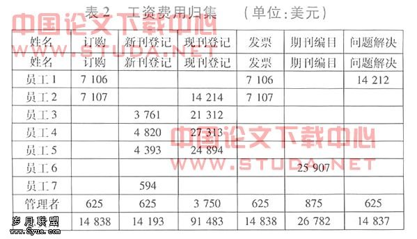 需要注意的是,除了实际发放的工资,还有一些其他的工资费用需要加入到成本库,如工资税、退休金等。这些费用占到总工资费用的某个比例,员工工资费用应该按这个比例增长之后再归集入成本库。另外一个问题是,管理费用和作业之间的因果关系并不明显,管理费用应该如何分配?管理者完成的管理工作(如监督、计划、写报告、参加会议等)并没有独立地被划分为主要作业,但这些活动与图书馆工作是密切相关的,理所当然应该将管理费用分配到图书馆作业中去。应该出某作业消耗的工时数占所有被管理作业消耗的总工时数的比例,按这个比例将管理费用分配到该作业中。员工工资费用分配情况如表2所示: