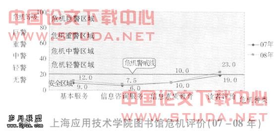 高校图书馆各项危机值以百分制计算,按危机程度分为5个等级,危机值K在0—20之间为绿色安全标准。若在监控中发现危机值偏离安全区域时,应查找原因,纠正偏差,将危机值调整至安全范围。诚然,危机标准也不是一成不变的,当环境条件发生变化时,标准也应做相应的调整,如此才能更好地适应图书馆服务对象的要求,也是观在图书馆的具体应用。高校图书馆危机管理要对图书馆日常工作进行动态监控,做到防微杜渐。上海应用技术学院图书馆自2007年起,对图书馆的危机进行监控。图5为该校图书馆2007-2008年危机同比评价结果(以服务危机项为例):