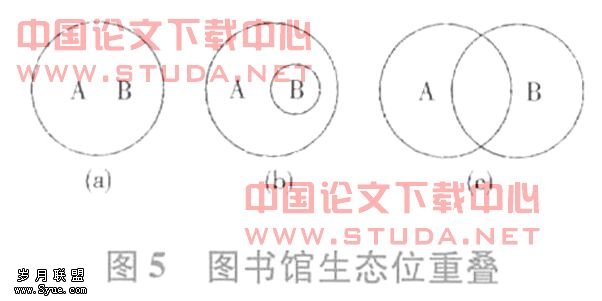 3.4.2 图书馆生态位重叠 界中,当两个生物利用同一资源或共同占有其他环境变量时,就会出现生态位重叠现象,这时就会有一部分空间为两个生态位的n维超体积共同占有。类似地,如果两个图书馆为了生存和的需要,占用同一种资源或环境变量时,这两个图书馆的生态位就会出现重叠,如两个图书馆馆藏类似的资源、拥有相同的读者群体,这些都是生态位重叠现象。如果两个图书馆具有完全一样的生态位,它们就会发生完全的生态位重叠。因此,生态位重叠是指图书馆之间生态位类似程度或者说生态位因素相同的比例,生态位重叠与图书馆间竞争强度成正比。设有A、B两个图书馆,它们的生态位重叠可能会出现如图5所示的重合、内包和交叉三种情况: