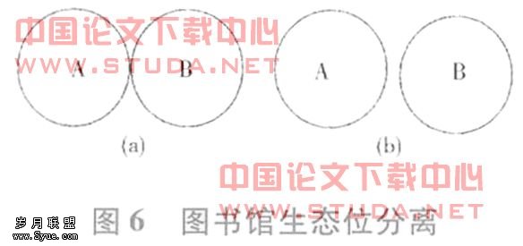 3.4.3 图书馆生态位分离 自然生态系统中,生态位分离是指两个亲缘关系密切的生物在异域分布,它们的生态位没有重叠。图书馆生态位分离是指两个或两个以上图书馆的生态位没有交叉、互不重叠。设有A、B两个图书馆,他们的生态位分离可能出现如图6所示的邻接和远离两种情况:
