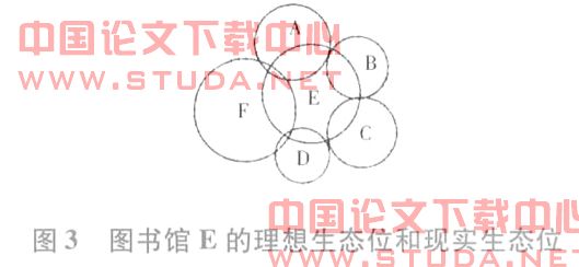 根据G.E.Htchinsuon(1957)的基础生态位和现实生态位理论,图书馆生存的全部最适生存条件称为图书馆的理想生态位,在这个生态位中,图书馆的所有环境条件都是最适宜的,而且不存在竞争者。然而,图书馆在实际生存和发展过程中,所遇到的全部条件不会那么理想,它包括了所有限制图书馆生存和发展的各种作用力(见图3)。图3中图书馆E与图书馆A,B,c,D,E,F发生竞争关系,其中图书馆E的理想生态位用中心的圆E面积代表,而图书馆E的现实生态位则用中间的类五角星面积表示。