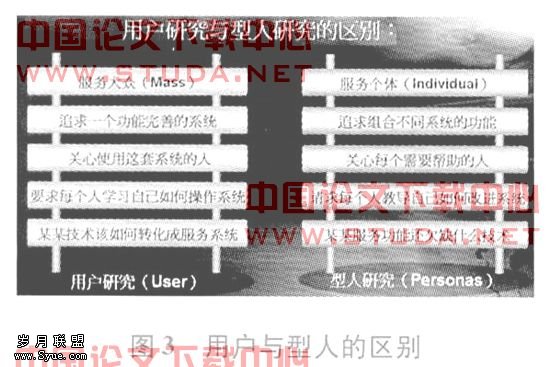对比用户研究,型人研究预设的服务对象是个体(Individual)而不是大众(Mass);型人模型在数字图书馆系统与技术领域中,追求的是组合不同系统的功能,而不是追求一个功能完善的系统;型人研究的动机是关心每个需要帮助的人,而不是只关心使用某套系统的人;型人模型的作用,是汇总每个教导自己如何改进系统的意见,而不是要求读者向图书馆员学习如何“熟练的”操作系统。用户研究与型人研究的区别,如图3所示: