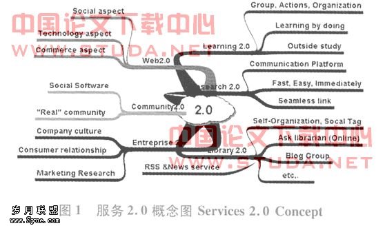 自Tim O'Reilly在2005年正式提出Web2.0的口号后,数字环境的技术应用,更加朝向交互性设计(Interactive Design)的走向。从Web2.0扩散到几乎所有数字领域的“2.0”思想,还包括:学习2.0(Learn-ing2.0):在课堂以外的地方,建立起真正的教学团体、活动与组织;研究2.0(Research2.0):建立一种提供研究者快速、容易与及时交流信息的通讯平台;2.O(Enterprise2.0):让企业内部文化向外扩散,让外部变化及时反应到内部;社群2.0(Communi-ty2.0):透过社会软件开发,使“虚拟”社群成为真实社群;图书馆2.0(Library2.0):使用不同的“新”技术,扩展服务范围与内容等。这些2.0式的环境与应用,加速拓展“网络用户行为”的研究面向多元化,强调某种思想的提升,而不仅仅是某些机构的提升。这为图书馆实践2.0服务,提供更多更广的思路,整理如图1所示: