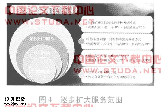 建议采用型人研究模式的原因是:传统图书馆,甚至传统数字图书馆试图通过一个理想系统再加上复杂细致的用户来提高用户信息行为效率,即使在讨论“个性化”时也主要是在内容选择上的个性化而不是服务方式上的个性化,这样做的背景主要是我们往往认为存在一种且只有一种理想的用户信息行为模式。但实际上,用户的心理与行为模式本身不一样,由于用户所处环境也不一样,而这些差异性又被不断丰富的环境解放出来并不断放大,所以我们必须认识和服从客观存在的不同的用户信息行为模式,并通过不同的信息渠道、流程、方法和交互模式等去更好地满足他们。换句话说,我们需要逐步扩大服务范围,如图4所示: