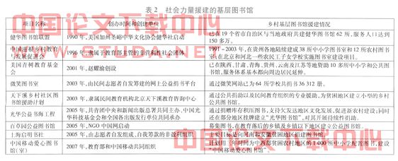 1.3.4 国内外社会力量援助图书馆项目 由于经济的不平衡,我国东部和中西部的基层图书馆发展水平存在巨大差距。目前,社会力量援建的主要是乡村基层图书馆,如表2所示: