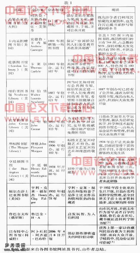 2.1 国外主要个人捐助图书馆(见表1)
