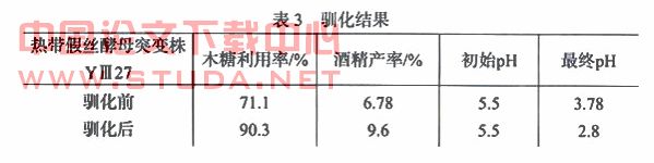 为稳定酵母利用木糖的能力,将菌株接入酵母木糖驯化培养基驯化培养数代,并逐步提高发酵液中的初始木糖含量,驯化后菌体逐渐适应了木糖发酵液环境,对代谢过程中的有害物质的抵抗力逐渐增强,木糖的利用率显著提高,酒精产量提高,见表3。