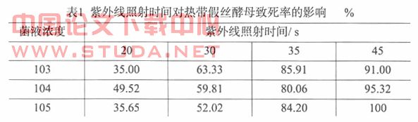 紫外线照射时间对热带假丝酵母致死率的影响见表1。