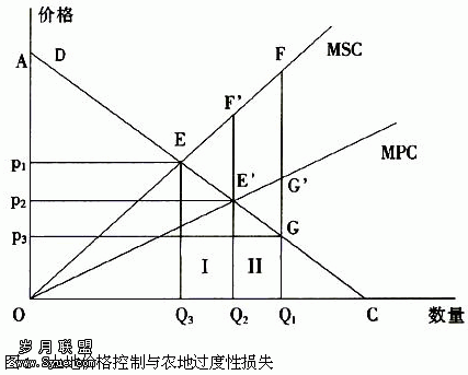 首先,可持续发展要求我们必须从全社会角度来分析土地价格与农地非农化的关系,这就是我们必须考虑到土地价格与农地总价值之间的差异。长期以来,传统经济学对农地的价值认识仅仅停留在狭义的经济价值(农产品价值)基础上,忽视了农地所拥有的生态、景观功能,食物安全与世代公平等社会价值和生态价值。由于这些价值及其产生的效益在目前的市场体系下是“外部性”效益,一般的土地使用者常常对此忽略。但是,国家作为全社会利益的代表,承受的农地非农化边际成本应为MSC ,即边际社会成本,农地非农化数量应为Q[,3],相对应的土地价格应为P[,3],社会总福利达到最大化AEO.此时的农地非农化配置效率最高,它是在包含了农地非农化的内部成本和外部性在内的价格机制作用下形成的非农化量,这就是农地的代价性损失。