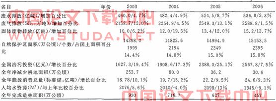 人和自然在渐进的发展过程中,人的价值在改造自然的过程中得到体现和发展,自然也从神造向人的改造转变。“由于人类心智的不确定性,只要它陷入了无知的境地,人就把自己当成了万物的尺度”。人类的自主性、能动性、功能性变得越来越强大,致使地球原生态的环境逐渐萎缩,物种的多样性也面临着前所未有的危机。人类的发展前途在哪里?人类的发展方向在哪里?人类是肆无忌惮的以人类社会自我发展为中心,还是建立一种“生态主义的人文关怀的发展模式”?现在,以人类发展为中心的“人类中心主义”的发展突现问题日益浮出水面,以环境统计2003~2006年为例: