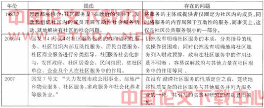 本文之所以从居民的社区服务需求着手,是因为基本需要原理是社区十大原理的第一大原理。这也与国发[2006] 14号(国务院关于加强和改进社区服务工作的意见》中的基本原则第一条:坚持以人为本不谋而合。说到底,社区服务的目的就是为了最大限度地满足群众的需要。因而从居民最需要的服务来探讨社区服务的本质是合乎情理的。一直以来,在有关社区服务的政策中,社区服务的性质都没有清晰界定,“福利服务,互助服务、自愿服务、商业服务”等性质不同的服务都用社区服务一个话语系统来统一,结果就出现了服务导向、服务主体、服务内容的混杂与混乱。(笔者对与社区服务相关的政策、提法及存在的问题进行了粗略梳理,见下表。