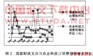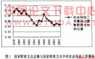 信息产品的准公共产品性质决定了公共部门必须参与信息产品的提供。政府公共信息指的是政府机关在其管理或提供服务的过程中制作、获得或拥有的信息。针对我国地区的情况,政府提供的公共信息应主要包括制度安排和政策、市场动态、技术服务等在内的信息。而现实并不容乐观,以国家财政每年用以农业科技三项费用为例,不仅这一比例非常低,而且在国家财政支出逐年以较大幅度递增的情况下,而国家财政用于农业科技三项费用的支出却几乎没有明显的增长。图一直观地说明了,除了个别年份以外,农业科技三项费用的支出在国家财政支出总额中所占的比重总体上呈下滑的态势。 在上述分析的基础上,通过对国家财政支出增长环比和农业科技三项费用增长环比的比较,可以进一步发现,进入20世纪90年代以后,国家财政支出的增幅大体上保持在一个相对稳定的区间内,但农业科技三项费用支出的增幅却变动得很激烈。而且,国家财政支出的增减并不必然伴随着农业科技三项费用支出的增减。甚至在有些年份,农业科技三项费用支出的增幅还出现了负增长。图二清楚地显示了这一分析结果。可见,在安排农业科技三项费用的财政支出方面具有政策上的不连贯性和具有较大的随意性,我国农村科技信息的供给缺乏一个稳定的财政资金保障。