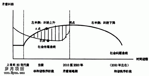 中国转型时期的社会问题曲线与治理曲线叠加的示意图(注意:社会问题曲线与治理曲线之间的空白处即A 、B 两点之间的距离表示一些问题未得到有效治理的程度)