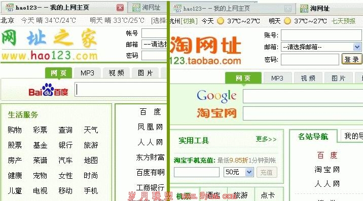 淘网址域名与大家熟知的网址导航站hao123.com 相近,从页面看,淘网址结构颜色与好123也是非常的相似。甚至于连ICO图标都大同小异。这不得不让人感叹于某些互联网企业模仿成瘾的弊病。