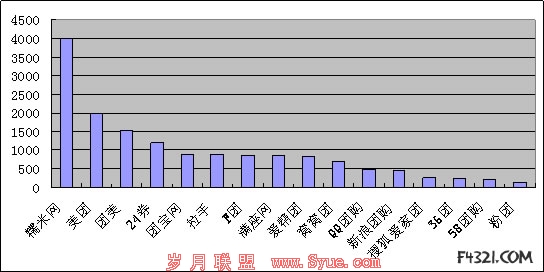 我对团购相关关键词百度指数进行了检索。首先来看下一些知名的团购网在百度中的指数排名情况,大致可以分为四个层次,一、糯米团一枝独秀单日搜索指数在4000左右;二、美团、团美等百度指数在1000~2000之间;三、拉手、F团百度指数在500-1000之间。四、QQ团购、新浪团购搜狐团购等百度指数在500以内。