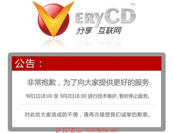 9月1日下午,国内著名的资源分享网站VeryCD无法访问,访问时出现如下技术维护公告: