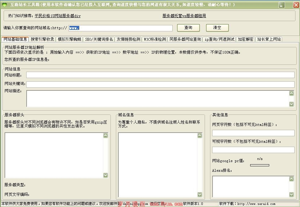 所以买网站之前一定要自己搞清楚这个网站的真实情况,这里给大家推荐一个我一个朋友业余写的一个站长工具,介绍请看http://www.seraid.com/gjxz/jxrj/2010/0905/760.html。