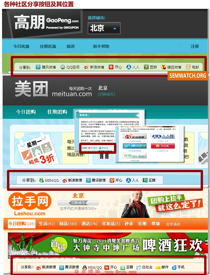 Tips:需要通过网站分析工具的配置区分一个页面的有效时段和过期时段从而避免数据的混淆,对两个页面上的访问也要进行区分。 Question:是否有团购网站对“交易时间”进行A/B测试来给同类商品的限时方法提供数据支持呢? Question:如何计算网站的转化率呢? 注:本篇中的问题会陆续在以后的章节中作答。 –> 3- 社交分享和病毒营销 团购网站,特别是Groupon.com严重依赖社交网络,通过病毒营销来为自己推广;甚至有论调把团购网站本身定义为社交网络。从每个团购网站到处悬挂的分享按钮可以看出他们对社交分享的重视。不过,社交网络营销到底有多少效果呢?如何改进呢?
