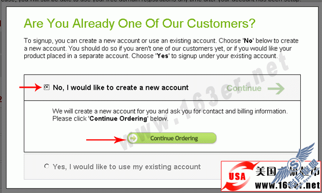 3、在产品选择页面中,会弹出注册或登录的提示。一般,选择create a new account,然后点击按钮continue ordering,即可回到产品选择页面。