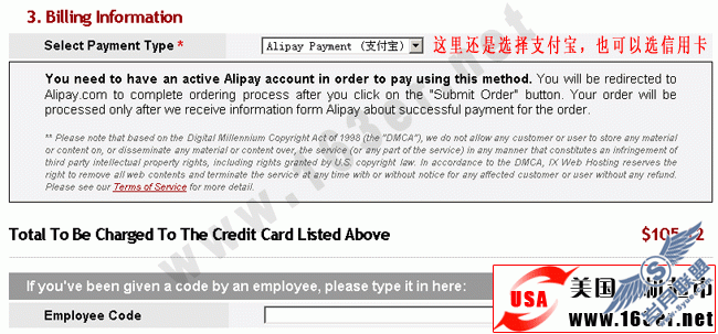 7、勾选I have read and accept the IX Web Hosting Terms of Service 同意服务条款。然后点submit order提交订单。如果你选择是支付宝付款,那么这时会跳转到支付宝付款界面,填写你的支付宝帐号和支付密码即可完成交易。支付成功之后,会跳转回IXwebhosting的成功页面,等待审核订单就可以了。几分钟之内你会收到一封邮件,是告诉你已经收到你的订单了,正在处理你的订单。再过几个小时之后,你会再收到一封邮件就是开通信了,是告诉你主机已经开通了,以及ftp帐号等信息。如果你在购买过程中遇到什么问题可以加我的QQ:16416648。