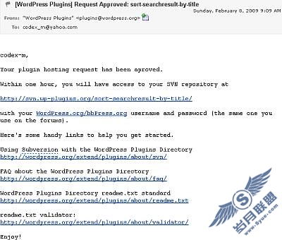 提交申请一天之后,WordPress会回答您的请求是否批准。例如,下面的屏幕快照,是经批准的插件请求确认: