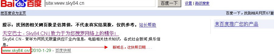 备案通过后,我就把网站重新上线了,原来的域名做了301重定向到新的,开始新一轮的漫长等待,每天就是更新文章,查看百度、google收录,google很快就用新域名的页面替换原来的,百度倒也是很快就收录了。可是竟然新旧域名一起收,而且主域名www.sky84.cn收录的很奇怪,如图1:
